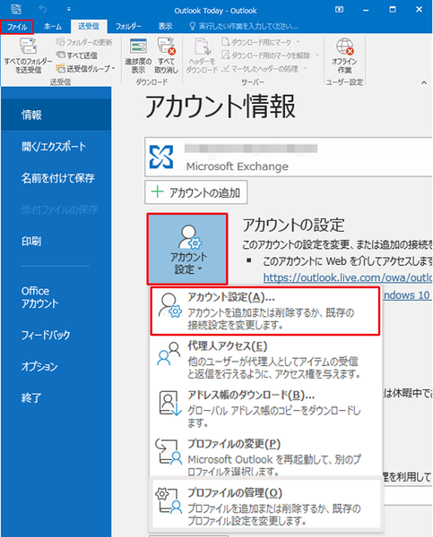 手順1. Outlook2016を起動し、メニューバーの[ファイル]→[情報]→[アカウント設定]→[アカウント設定(A)...]の順にクリックします。