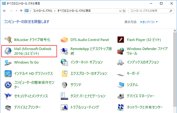 ※ 「プロファイルの管理」がない場合 コントロールパネルを表示します。 「Mail (Microsoft Outlook 2016)」を選択します