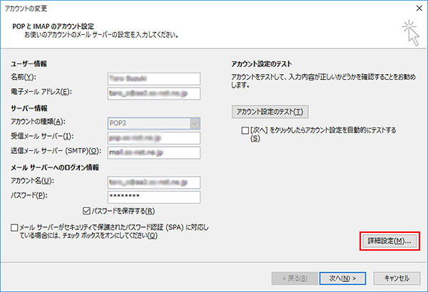 アカウントの種類 (A) POP3が選択