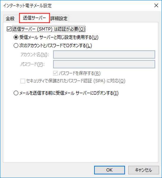 手順6. [送信サーバー]タブが表示されたら、以下のように設定されているか確認します。 確認が終わったら[詳細設定]タブをクリックします。
