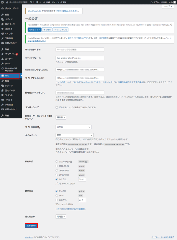 管理者メールアドレス WordPressのインストール時の管理者のメールアドレスを表示しています。 変更があれば編集します。