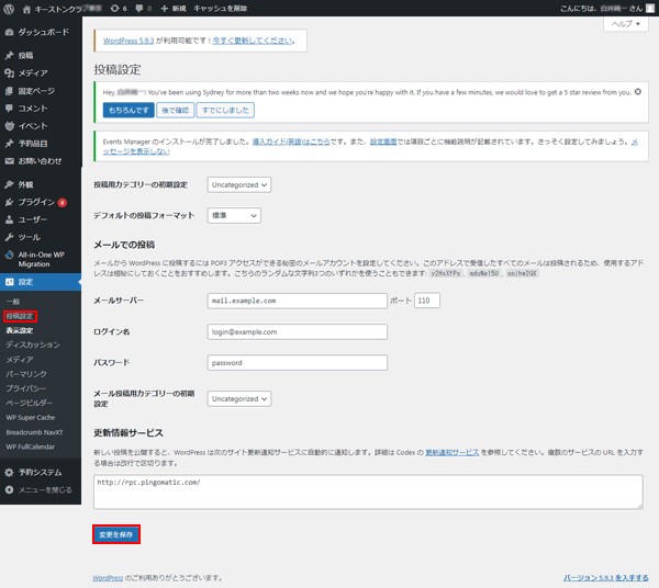 3. [投稿設定]をクリックします。下記の項目を変更した時は、下部の[変更の保存]をクリックして下さい。