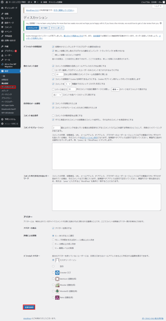 5. [ディスカッション設定]をクリックします。下記の項目を変更した時は、下部の[変更の保存]をクリックして下さい。