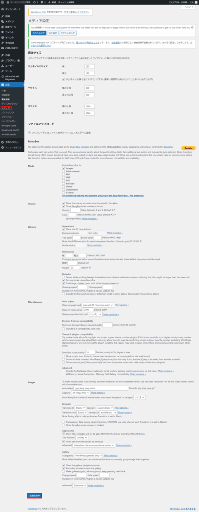 6. [メディア設定]をクリックします。下記の項目を変更した時は、下部の[変更の保存]をクリックして下さい。