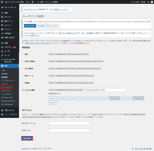 7. [パーマリンク設定]をクリックします。下記の項目を変更した時は、下部の[変更の保存]をクリックして下さい。