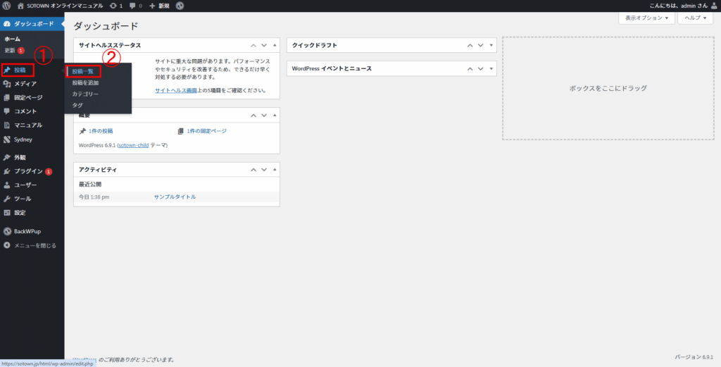 2. 左メニューの①「投稿」から②「投稿一覧」をクリックします。