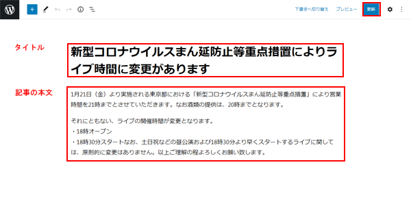 5. 編集する[タイトル]又は[記事の本文]をクリックして編集します。編集が終わったら、右上の[更新]をクリックします。