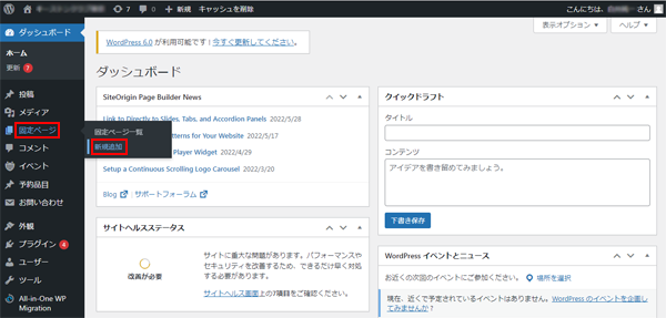 2. 左メニューの[固定ページ]から[新規追加]をクリックします。