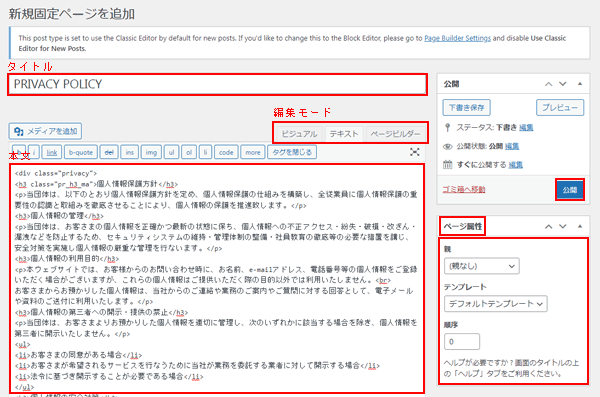 3. 新規固定ページを追加が表示されます。「タイトル」と「本文」の項目を入力したら、[公開]をクリックします。