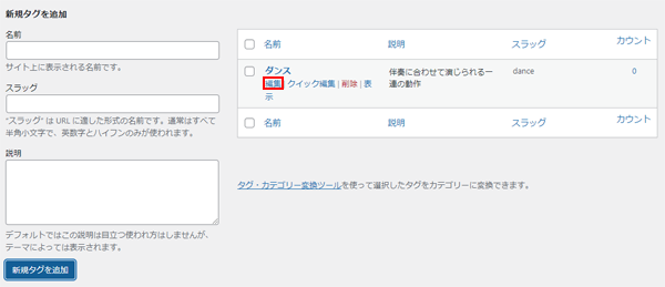 3. 右のタグ一覧で編集したいタイトルにマウスを合わせるとメニューが表示するのでそこで[編集]をクリックします。