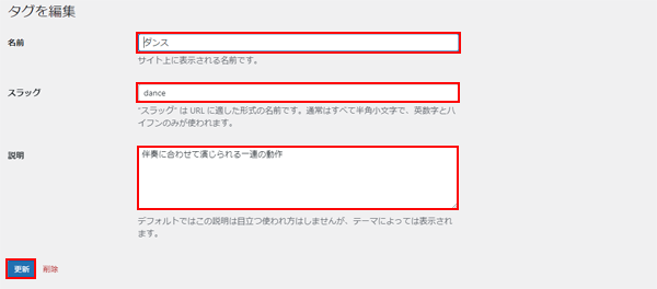 | 名前 | タグ名を入力します。タグが設定されている記事をブログで表示すると、タグ名が表示されます。 |