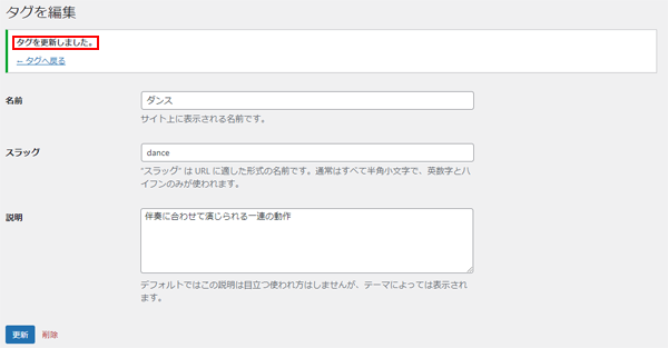 5. 「タグを更新しました。」のメッセージが表示したら、更新完了です。